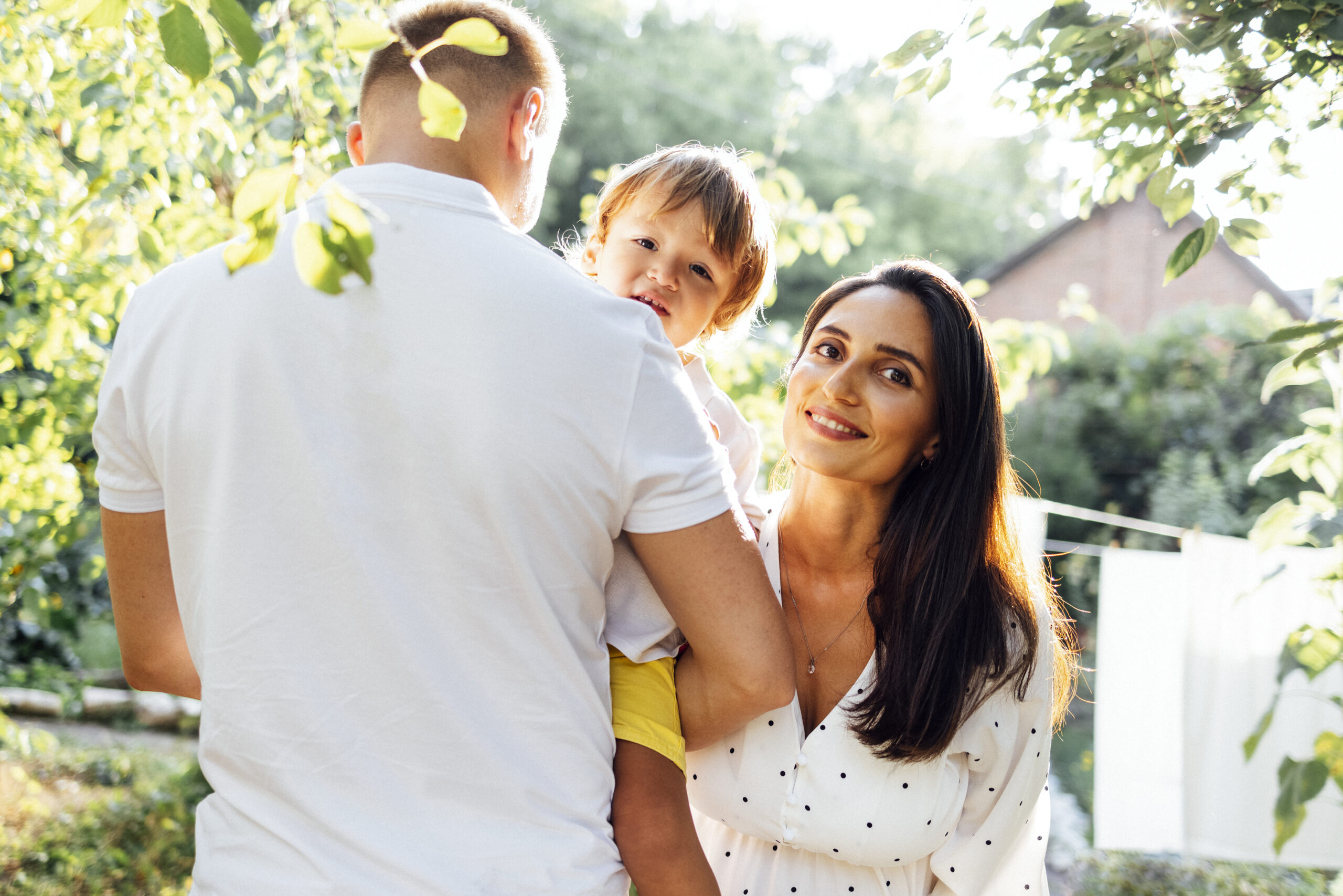 Cute family in light casual clothes in garden on terrace of their house.